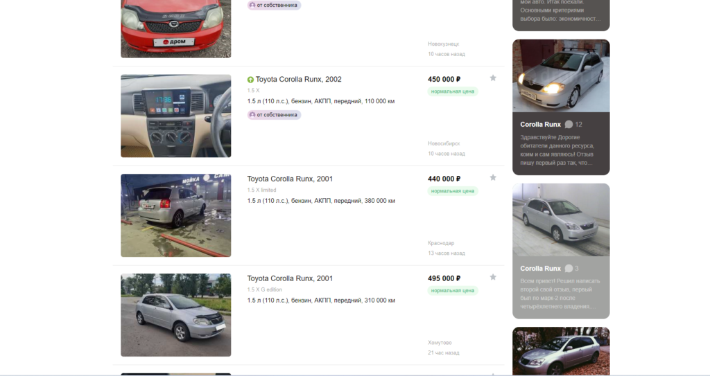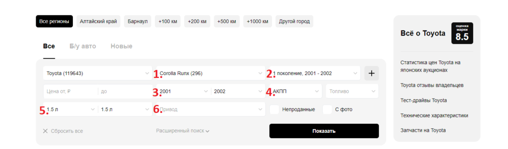 Выбираю: 1. Модель Corolla Runx; 2. Поколение 2001-2002; 3. Год 2001-2002; 4. Коробка автомат АКПП; 5. Объем двигателя 1.5 л; 6. Можно выбрать привод. Остается нажать кнопку «показать» и дром выдаст похожие авто.