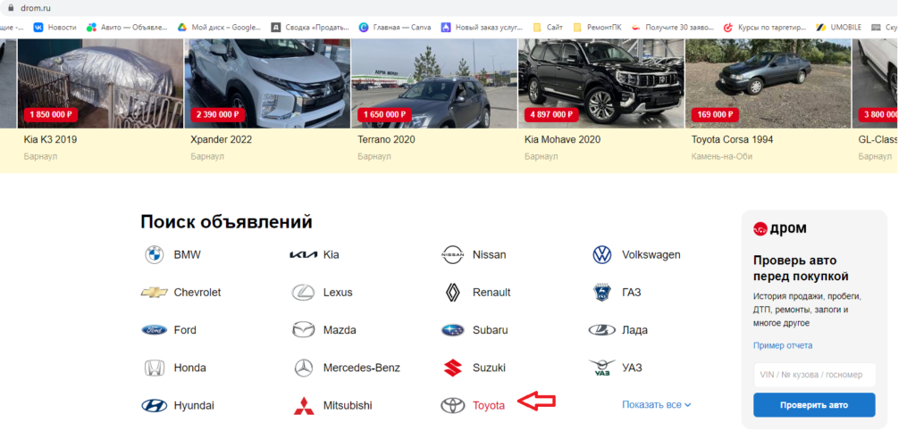 - Захожу на Drom.ru (желательно выбрать свой город), нажимаю категорию «Toyota»